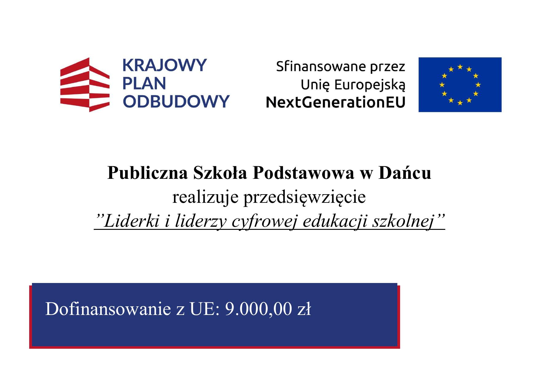 Publiczna Szkoła Podstawowa w Dańcu otrzymała grant na zakup cyfrowych materiałów dydaktycznych w ramach przedsięwzięcia "Liderki i liderzy cyfrowej edukacji szkolnej" dofinansowanego z Krajowego Planu Odbudowy i Wzmacniania Odporności, finansowanego ze środków Intrumentu na Rzecz Odbudowy i Wzmacniania Odporności oraz Unii Eurepojskiej - NextGeneration EU, KomponentC: Transformacja Cyfrowa, Reforma: C2.1: Zwiększenie skali zastosowań rozwiązań cyfrowych w sferze publicznej, gospodarce i społeczeństwie, Inwestycja C2.1.3: E-kompetencje, KPOD.05.08-IW.06-0110/25.